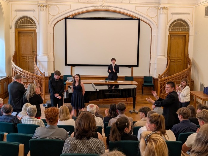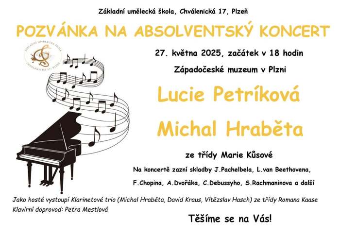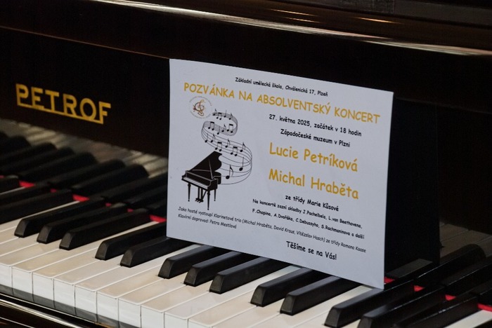 V úterý 27.5.2025 proběhl absolventský koncert Lucie Petríkové a Michala Hraběty v Západočeském muzeu v Plzni. Koncert byl velmi pestrý, absolventi podali nadprůměrné výkony. Děkujeme paní uč. Marii Kůsové za přípravu, klarinetovému triu za pěkné vystoupení a p. uč. Petře Mestlové za korepetici.