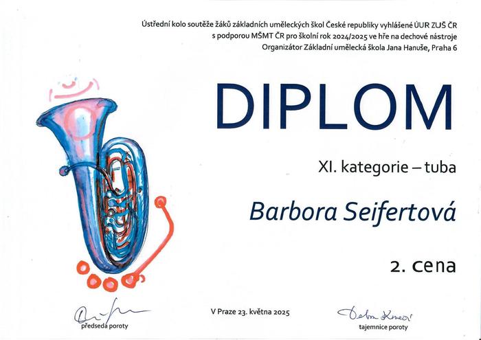 V pátek 23.5.2025 proběhlo ústřední kolo soutěže ve hře na žesťové nástroje v Praze. Z naší školy se do celostátního kola probojovala žákyně p. uč. J. Candry Barbora Seifertová a získala 2. místo ve hře na tubu. Srdečně gratulujeme a děkujeme